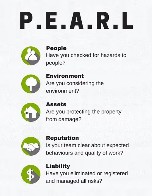 PEARL - People, Environment, Assets, Reputation, Liability. Just like Righty-tighty this memory-jogger could save you some grief. So be proactive - remember PEARL, and more importantly, use it!